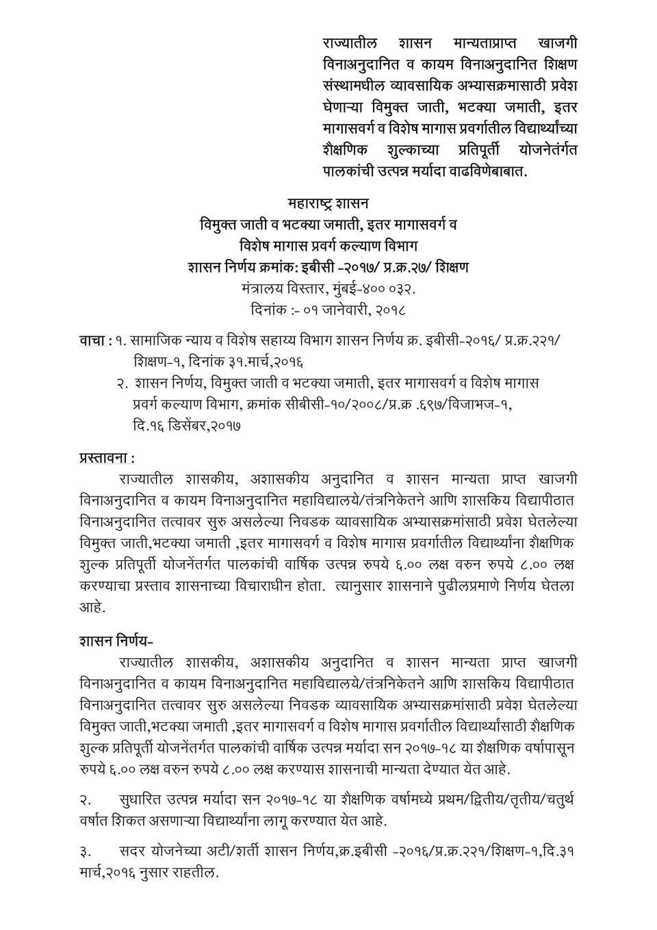 पालकांची उत्पन्न मर्यादा वाढविणेबाबात.
