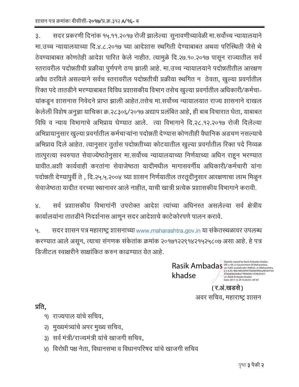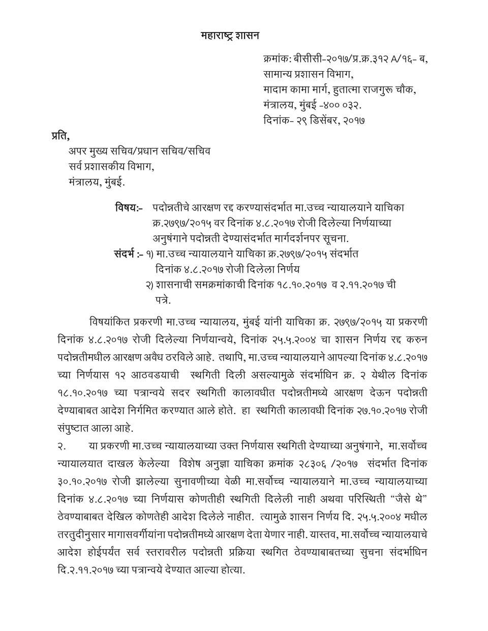 पदोन्नतीचे आरक्षण रद्ध करण्यासंदर्भात मा.उच्च न्यायालयाने याचिका क्र.२७९७/२०१५ वर दिनांक ४/८/२०१७ रोजी दिलेल्या निर्णयाच्या अनुषंगाने पदोन्नती देण्यासंदर्भात सूचना.