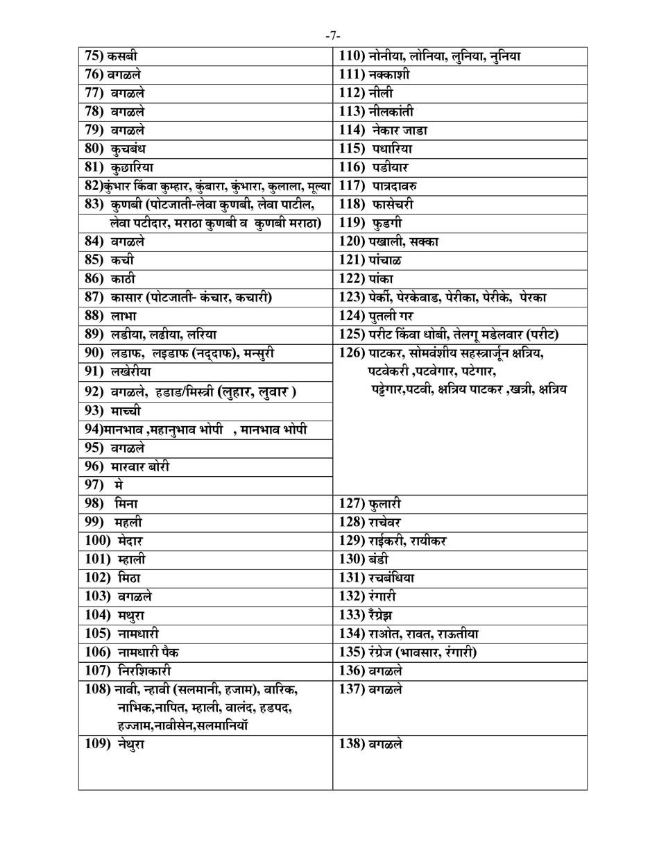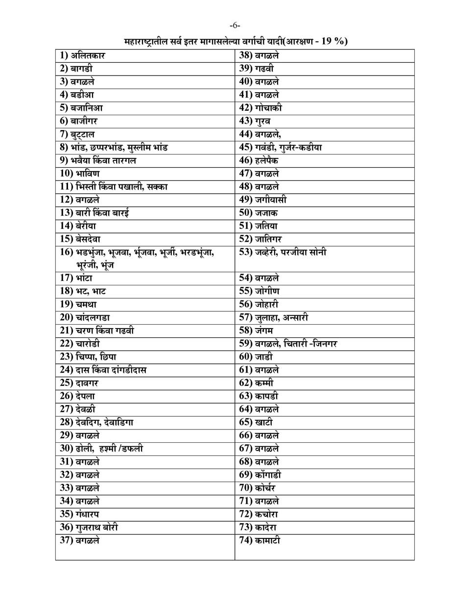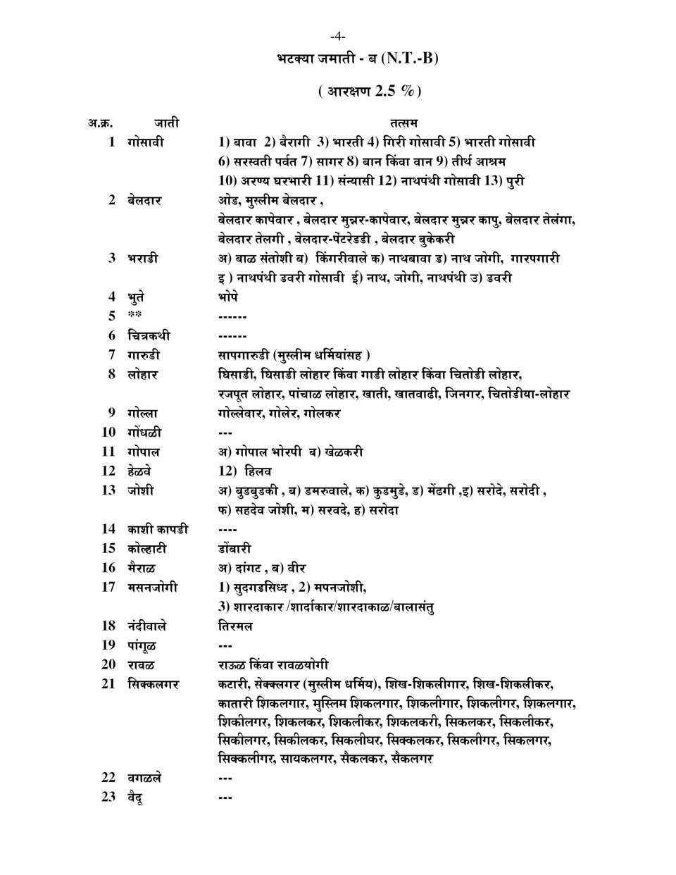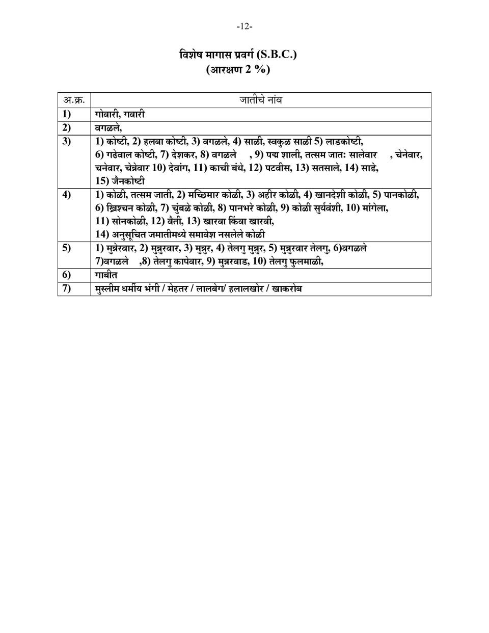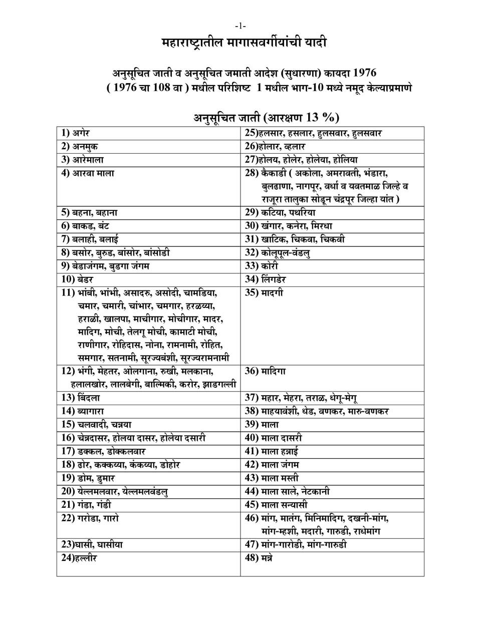 महाराष्ट्र राज्याची अनुसूचित जाती, विमुक्त जाती, भटक्या जमाती, इतर मागासवर्ग व विषेश मागासप्रवर्गाची यादी.